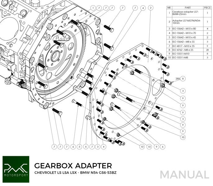 PMC Motorsport hliníkový adaptér (příruba) GM CHevrolet V8 LS s manuální převodovkou z BMW
