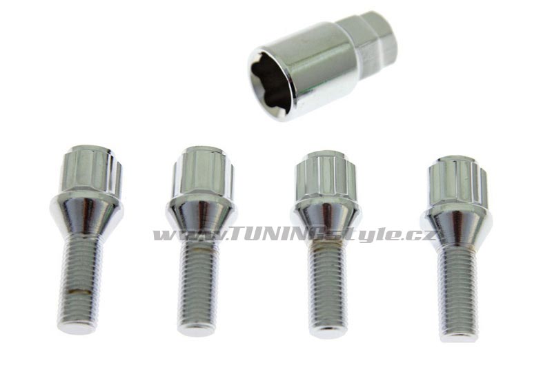 Sada bezpečnostních šroubů s klíčem. Sada obsahuje 4x šroub , klíč. Údaje: Rozměr : M12 Tvrdost: 10,9 Délka závitu: 28mm Průměr klíče: 19/21 Pasuje pro vozy : MERCEDES W107 SL -> 8/85, W 116, 250S , 450SEL , 6.9 , W123 , 200D , 280E , W124 , 300TE , W126 , 280S , 500SEL -> 8/89 , W201 , 190D , 190E -> 8/84 ,  W126 , 260 SE , 560 SL 8/85->, W201 , 190D , 190... Celý popis