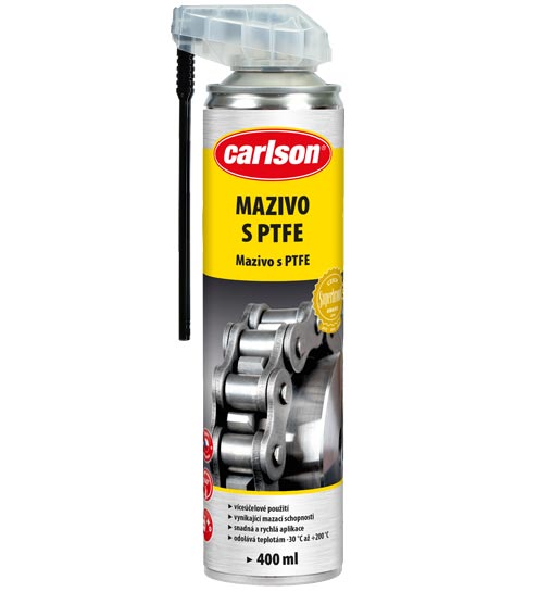 CARLSON® Mazivo s PTFE (polytetrafluorethylen) je multifunkční přípravek s velmi dobrými mazacími a konzervačními vlastnostmi. Je vhodný pro použití v širokém rozmezí provozních teplot od -30 °C až po +200 °C, pro mazání řetězů, ložisek, závěsů a kluzných ploch v domácnostech, v automobilovém i strojním průmyslu.