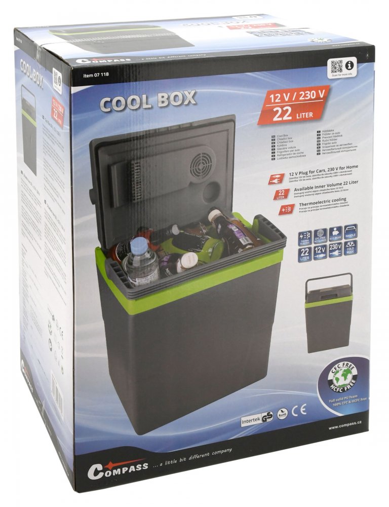 Přenosný chladicí box napájený z 12V zásuvky autozapalovače, nebo 230V z běžné zásuvky.
