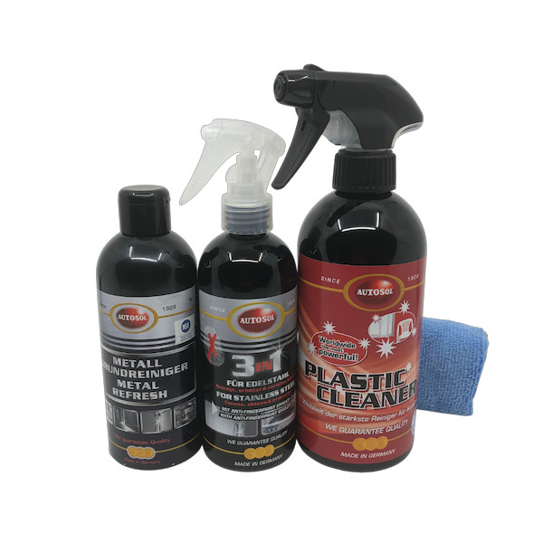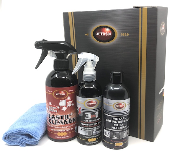 Dárková sada přípravků renomované značky Autosol obsahuje přípravky pro čištění plastů a přípravky na kovové povrchy, nerez a mikroutěrku.