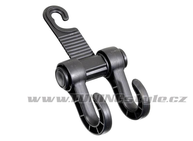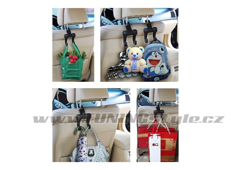 Praktický držák k zavěšení na opěrku hlavy předních sedadel automobilu. Je vybaven dvěma háky, na které lze zavěsit např. nákupní tašku, oděvy, batoh atp. Díky robustní konstrukci těla držáku je možné zavěsit zavazadla až do hmotnosti 3 kg. Celý popis