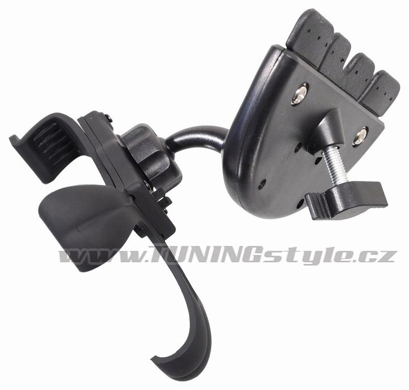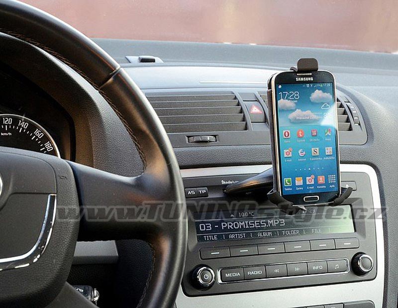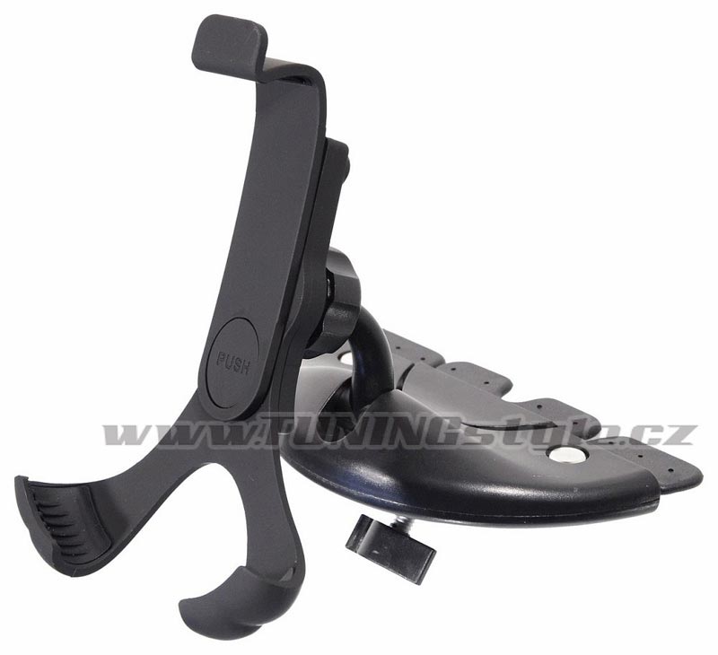 Držák telefonu či navigace, který se připevní do štěrbiny CD disku autorádia. Vhodné pro telefon či navigaci (až do 14 cm). Široká škála nastavení úhlů držáku (360°) umožňuje upnutí telefonu na šířku i na výšku a nastavení libovolného sklonu.