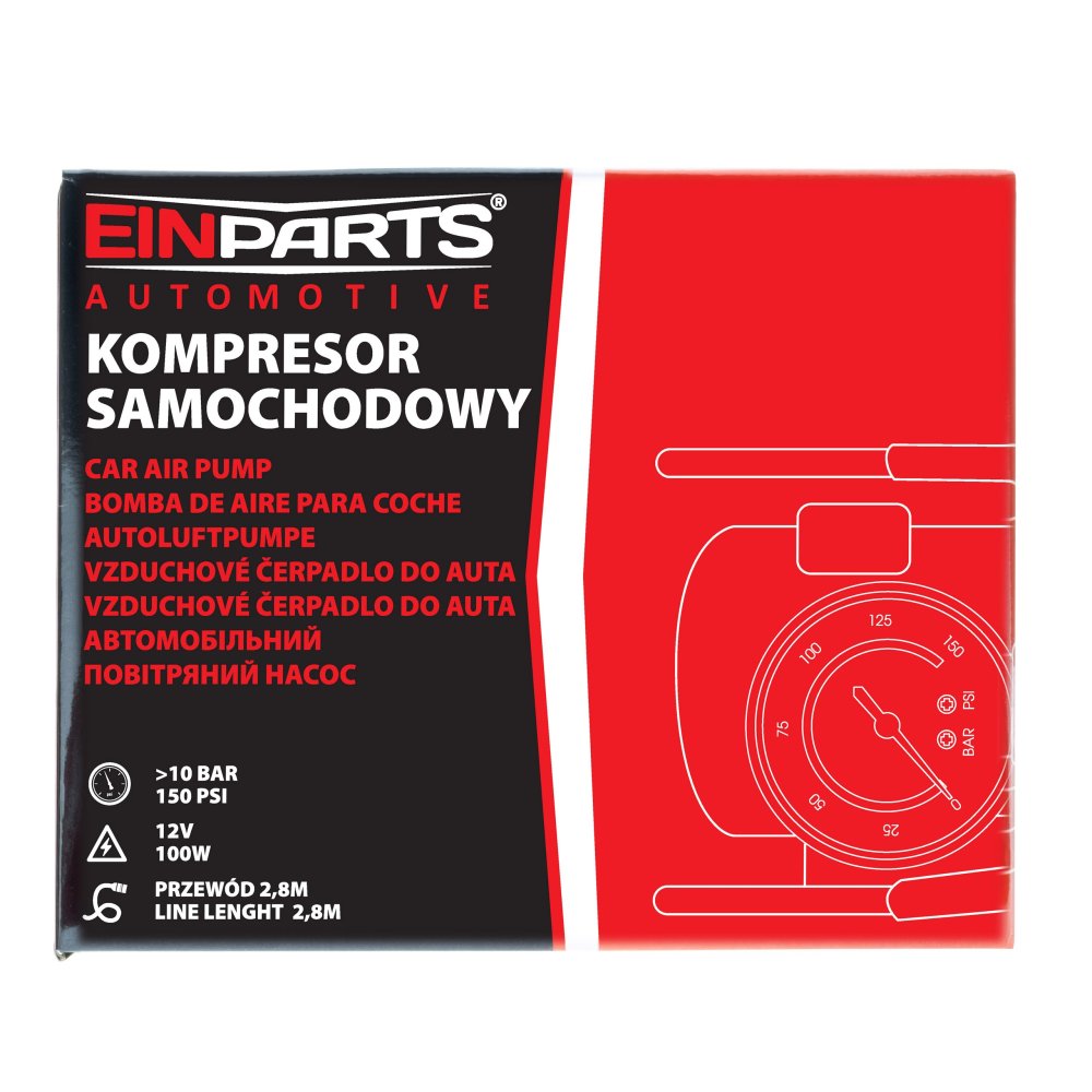 Kovový kompresor EINPARTS AUTOMOTIVE 12V 10 Bar 150 PSI je spolehlivý nástroj, který umožňuje rychlé nafukování automobilových pneumatik, jízdních kol, sportovních míčů a mnoha dalších položek. Poháněn z auta. Ovládejte tlak pomocí velkého manometru a snadno ho přenášejte kamkoli díky pohodlné rukojeti.
