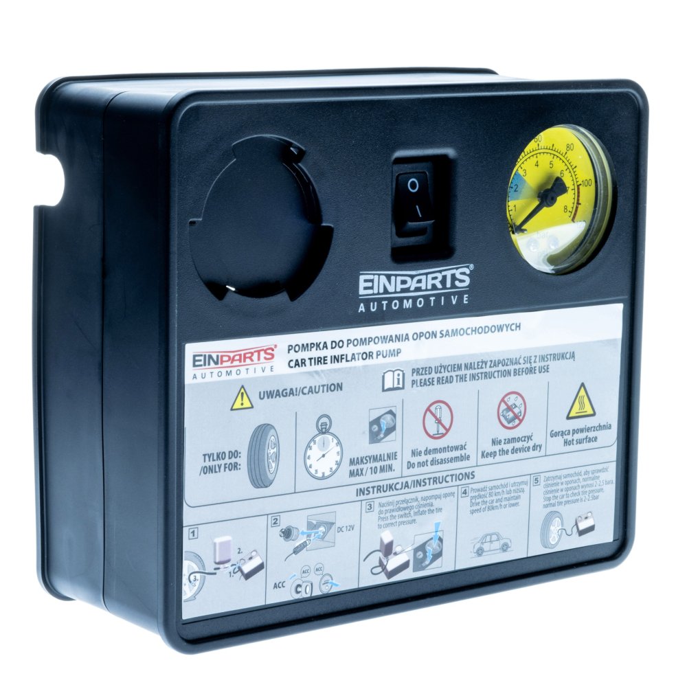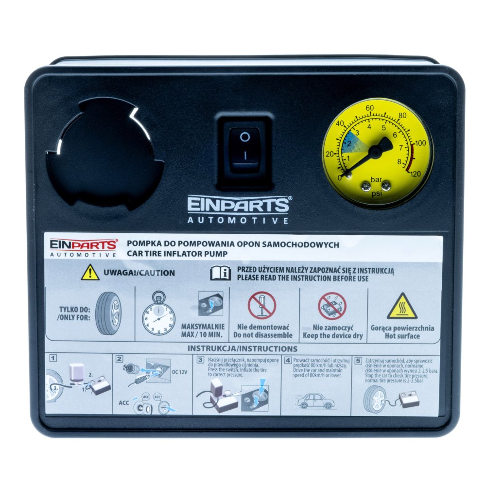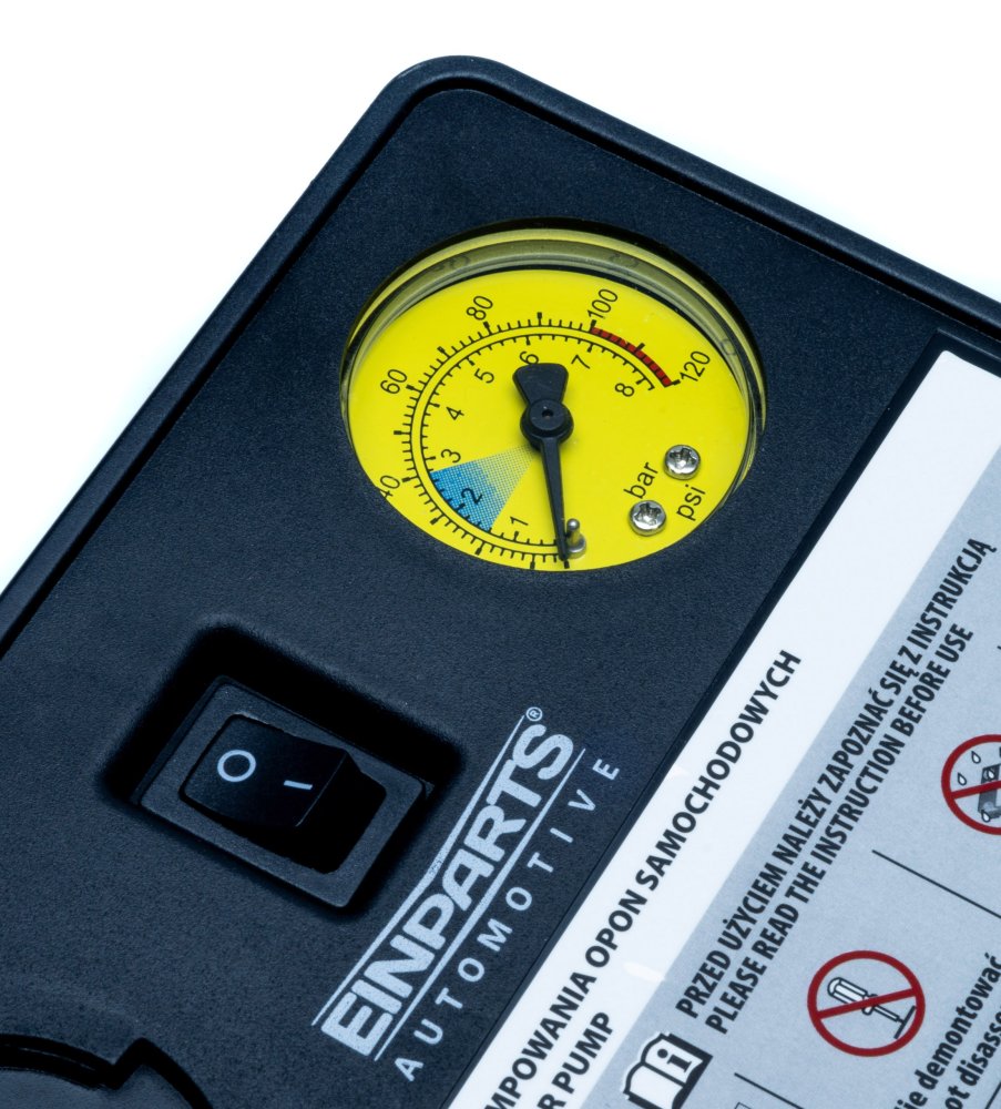 KOMPRESOR - Technické údaje: Teplota skladování: -30°C do +70°C Provozní teplota: -20°C do +60°C Účinnost: Velké kolo (50 litrů) nafoukne za cca 5 min na 2,5 baru Délka napájecího kabelu: 3m Délka vzduchové hadice: 50 cm Maximální odběr proudu: 10A Maximální výkon: 120W Maximální pracovní tlak: 10 bar Elektrické připojení: zástrčka do auta