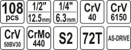 Gola sada 1/2" a 1/4" obsahuje 108ks: nástavců, prodlužovacích nástavců, ráčny s plastovou rukojetí a další příslušenství. Vyrobené z kvalitní oceli CrV40, CrV6150, CrV50BV30, CrMo440 a S2 s funkcí AS-DRIVE. Ráčny mají jemný 72 zubý chod.