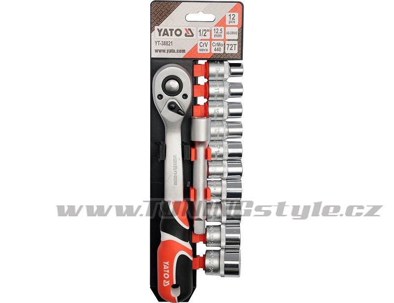 Sada s golou 1/2" s plynulým 72 zubým chodem a plastovou pohodlnou rukojetí. Příslušenství tvoří 11 ks nástavců z nichž jeden je prodlužovací. Zhotovení z kvalitní chromvanadiové oceli CrMo440 a CrV50BV30 s funkcí AS-DRIVE.