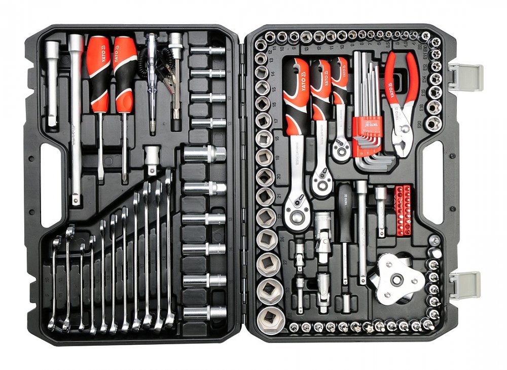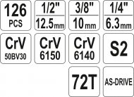 Gola sada 1/2", 3/8", 1/4" obsahuje 126ks: nástavců, prodlužovacích nástavců, ráčny s plastovou rukojetí, kloubové nástavce očkoploché klíče a další příslušenství. Vyrobené z kvalitní chromvanadiové oceli CrV6140, CrV6150, CrV50BV30 a S2 s funkcí AS-DRIVE.