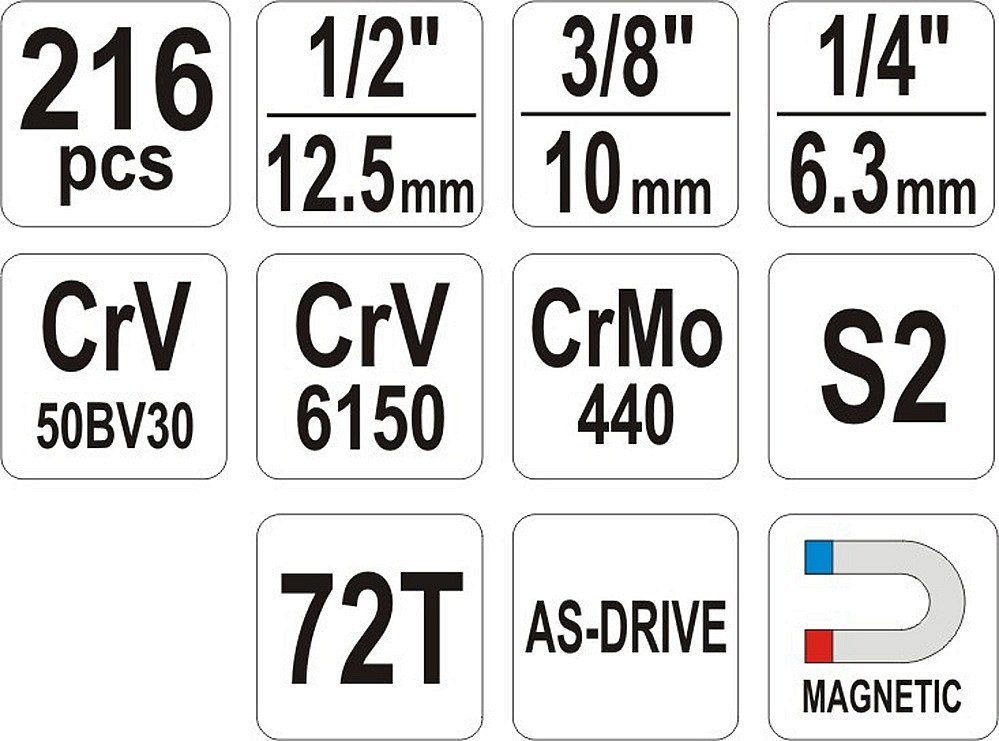 Gola sada 1/2", 3/8", 1/4" obsahuje 216ks: nástavců, prodlužovacích nástavců, ráčny s plastovou rukojetí, kloubové nástavce očkoploché klíče a další příslušenství. Vyrobené z kvalitní chromvanadiové oceli CrV6140 a CrV50BV30, S2 s funkcí AS-DRIVE.