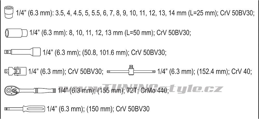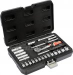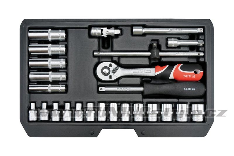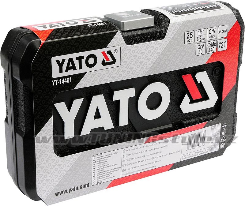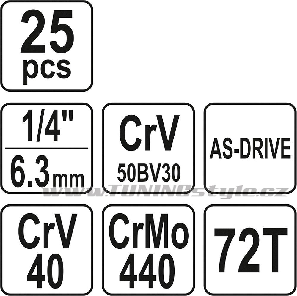 Gola sada 1/4" obsahuje 25ks: nástavců, prodlužovacích nástavců, ráčnu s plastovou rukojetí a další příslušenství. Vyrobené z kvalitní oceli CrV50BV30, CrV40, CrMo440 s funkcí AS-DRIVE. Ráčna má jemný 72 zubý chod.