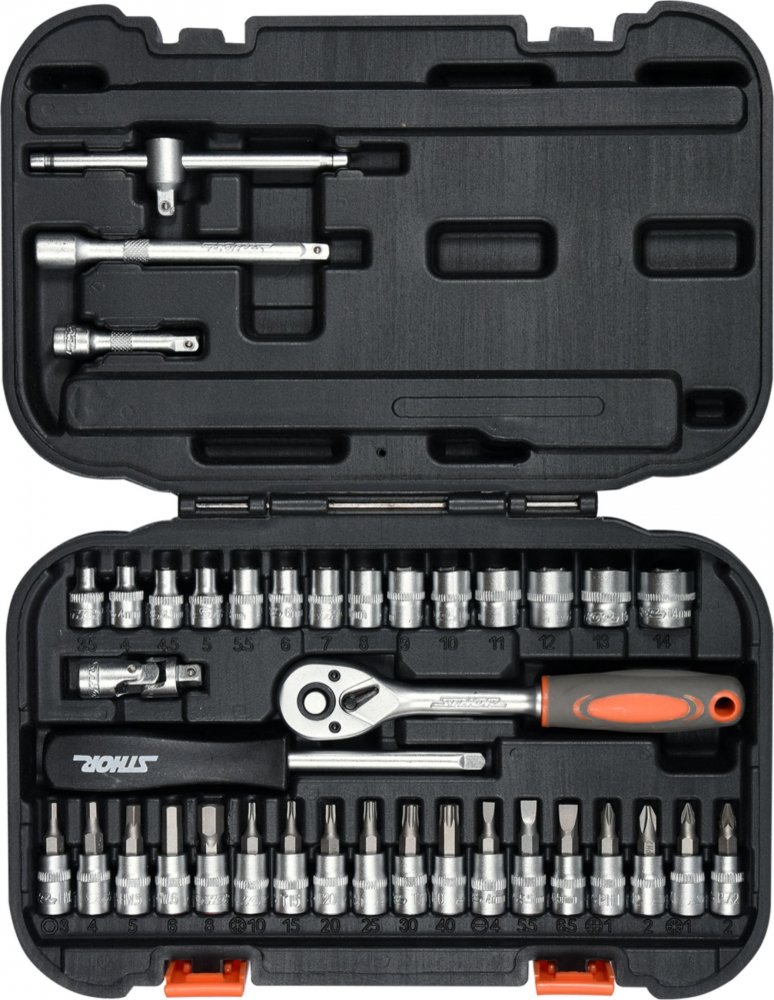 Gola sada 1/4" obsahuje 38ks: nástavce a ráčnu s plastovou rukojetí. Vyrobené z kvalitní oceli s funkcí AS-DRIVE. Funkce AS-DRIVE umožňuje vyvinout větší kontaktní sílu, neboť ke kontaktu se šroubem nedochází na hranách šestihranu, nýbrž v první třetině styčných ploch. Tím nedochází k poničení hlavice šroubu. Ořech mnohdy povolí i matice a šrouby již poničené. Sada je přehledně uložena v p... Celý popis