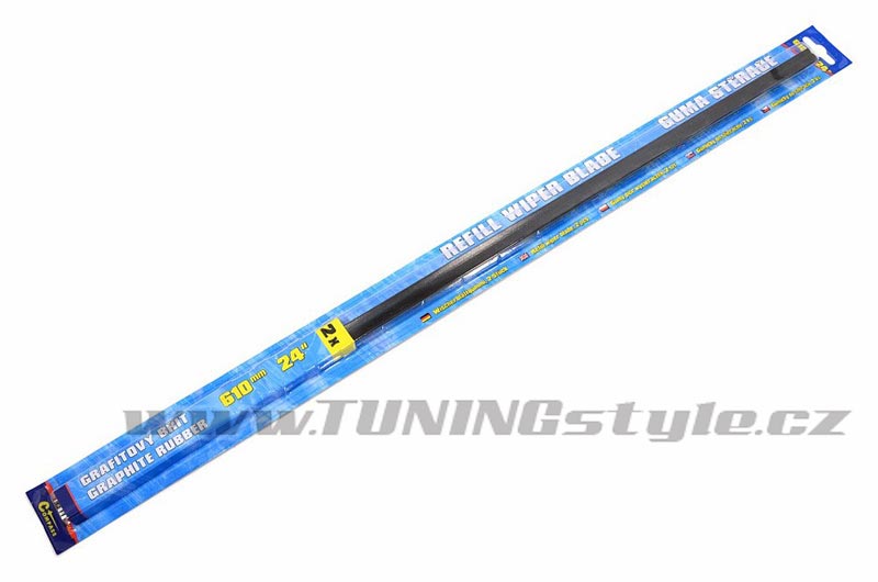 Sada 2 ks náhradních pryžových vložek do lišty stěrače. S plastovou lištou. Při použití na kratší stěrače lze gumičku zkrátit nožem. Délka 610 mm, materiál grafit.