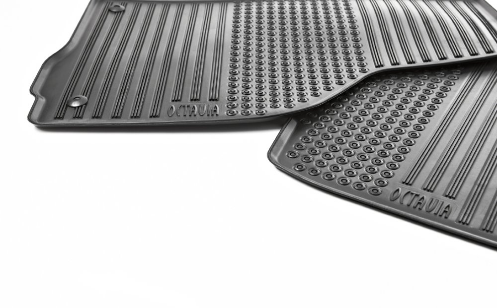Sada obsahuje dva přední autokoberce s nápisem „Octavia“ vyrobené z vysoce kvalitního materiálu, termoplastického elastomeru. Jejich povrch neklouže a dokonale zachycuje vlhkost i nečistoty. Koberečky svým tvarem přesně vyplňují prostor pod nohama cestujících, čímž dělají interiér vozu mnohem útulnější, a pasažéři si tak užijí pohodlnou jízdu nehledě na počty ujetých kilometrů.