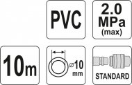 Profesionální vzduchová hadice s délkou 10 m zakončená rychlospojkami. Hadice je zhotovená z PVC odolného vůči nízkým i vysokým teplotám, může tak být použita i mimo dílnu. Rychloupínací spojka 1/4" vhodná pro běžné využití v dílně nebo výrobním závodě. Technická data Vnitřní průměr 10 mm Délka hadice 10 m Rychlospojky 1/4" Zhotovení PVC Max. tlak 2 MPa Celý popis