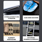 Stan je vybaven střešním oknem, které umožňuje obdivovat hvězdy a vpouští do interiéru další světlo, čímž vytváří jedinečnou atmosféru během nočních dobrodružství.