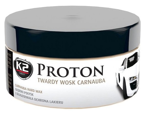 K2 Proton je vysoce účinný a efektivní vosk, který je založený na nejtvrdším známém přírodním vosku karnauba. Zajišťuje zrcadlový lesk a zesiluje barvu laku. Snadně se aplikuje a leští. Poskytuje dlouhodobou ochranu dokonce až po tucet, nebo i více mycích cyklů. Po nanesení se nátěr stává zcela hladkým, což umožňuje kapkám vody odtéct z laku. Chrání proti oxidaci a UV záření. Celý popis