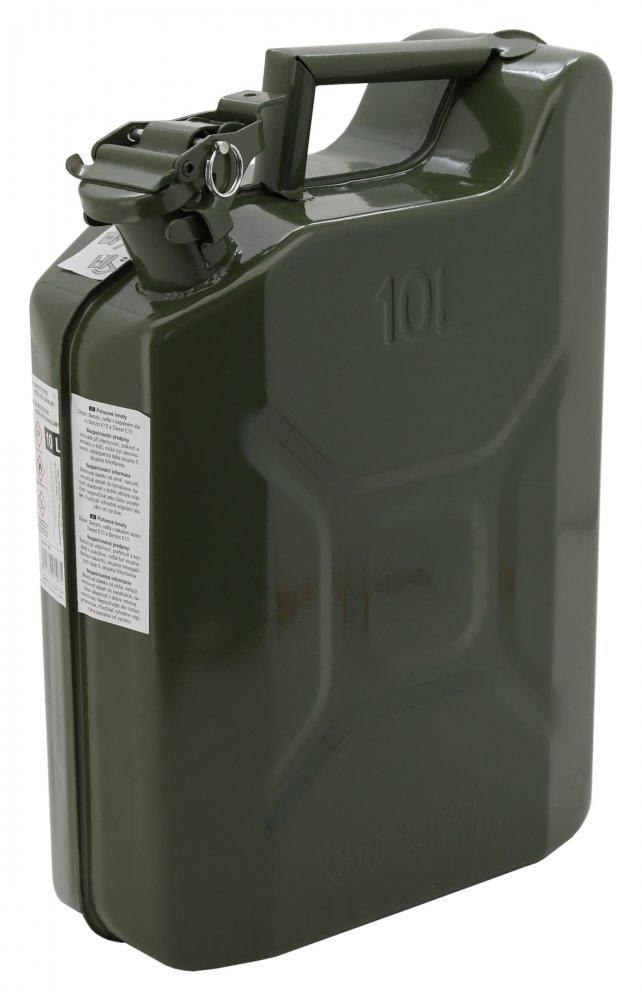 Kovový kanystr na pohonné hmoty o objemu 10 l. Hrdlo kanystru je opatřené uzavíratelným mechanismem se zátkou, těsněním a jištěním proti otevření. Profilované boky kanystru zajistí pevný tvar, nedochází tak k prohýbání stěn vlivem tlaku. Kanystr je na vrchní straně opatřen praktickou rukojetí usnadňující manipulaci. Povrch kanystru je tradičně zeleno-olivově nabarven, materiál je tak ochráněn p... Celý popis