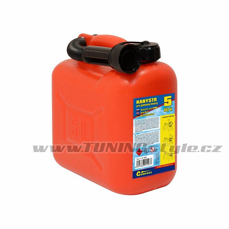 Kanystr určený pro pohonné hmoty. Produkt je vytvořen z odolávajícího plastu červené barvy, s ergonomicky tvarovaným madlem na vrchní části těla. Vnější rozměry 24 x 26 x 16,5 cm propůjčují kanystru obejmný prostor, až pro 5l pohonných hmot. Součástí kanystru je nálevka délky 17 cm, opatřená ohebným krčkem a víčkem, jehož součástí je kolík, se kterým je možné vyznačit druh pohonných hmot (benzí... Celý popis