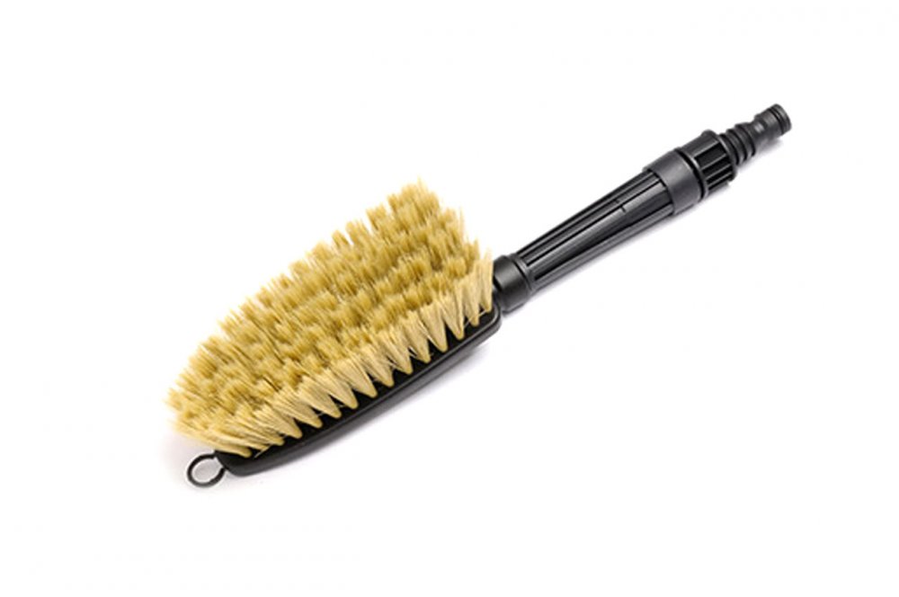 Kartáč s umělými štětinami na mytí vozidel s oplachovou špičkou Vlastnosti: Husté, neškrábající polyesterové štětiny zlomené na koncích pro usnadnění mytí a zabránění poškrábání laku, Praktická odnímatelná rukojeť určená k mytí a nalévání. Rychlé připojení pomocí rychlospojky nebo přímo na hadici Ventil, který reguluje šířku a velikost proudu vody Délka: 33 cm Celý popis