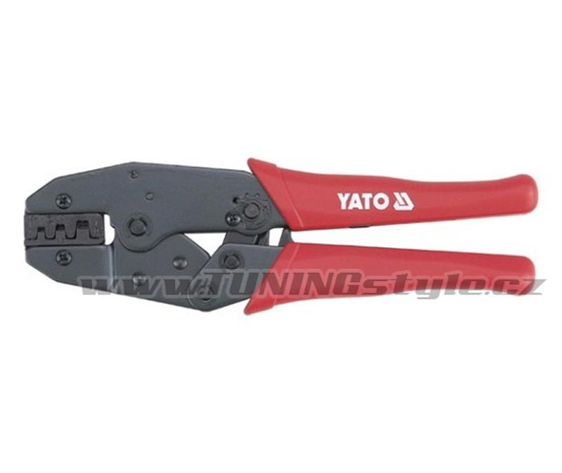 Kleště YT-2250 pro krimpování izolovaných konektorů, se zčernalým povrchem, který chrání před korozí, a s plastovými kryty rukojetí. Rohatkový mechanismus umožňuje rychlé a přesné upnutí bez použití nadměrné síly.