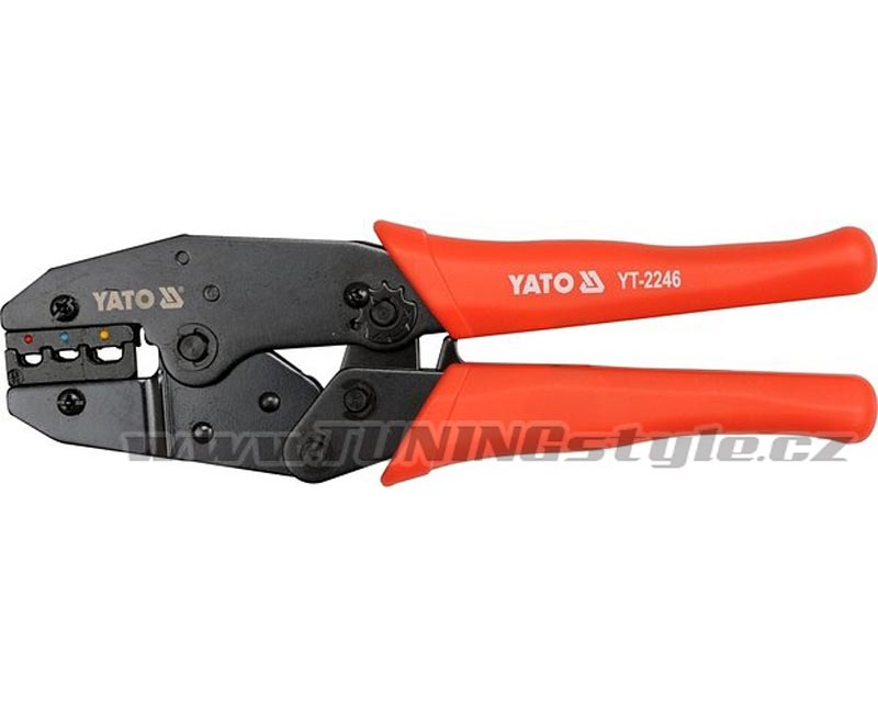 Kleště YT-2246 pro krimpování izolovaných konektorů, se zčernalým povrchem, který chrání před korozí, a s plastovými kryty rukojetí. Rohatkový mechanismus umožňuje rychlé a přesné upnutí bez použití nadměrné síly.