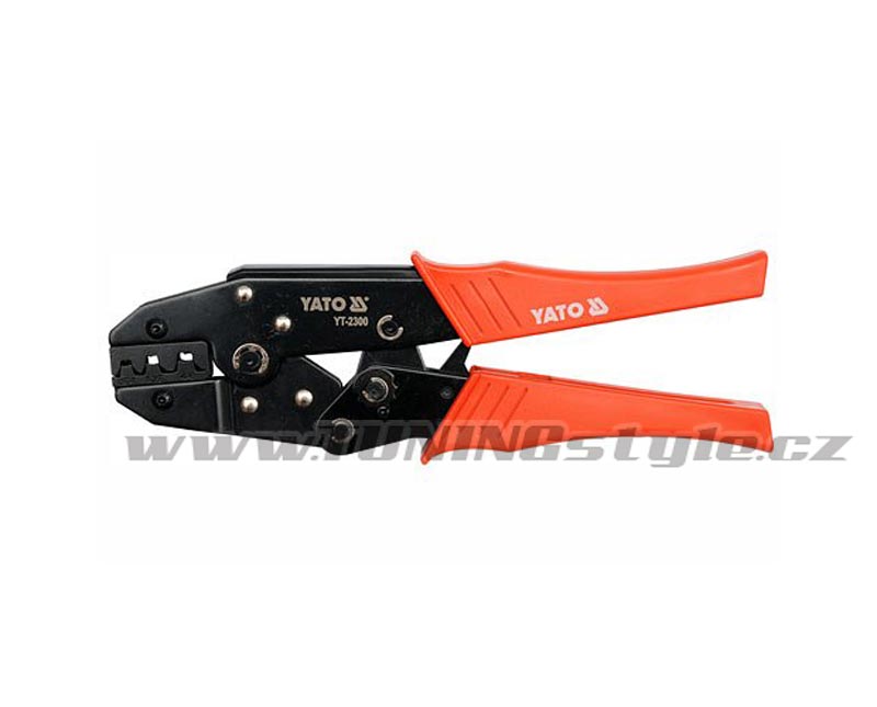 Kleště YT-2300 pro krimpování izolovaných konektorů, se zčernalým povrchem, který chrání před korozí, a s plastovými kryty rukojetí. Rohatkový mechanismus umožňuje rychlé a přesné upnutí bez použití nadměrné síly.