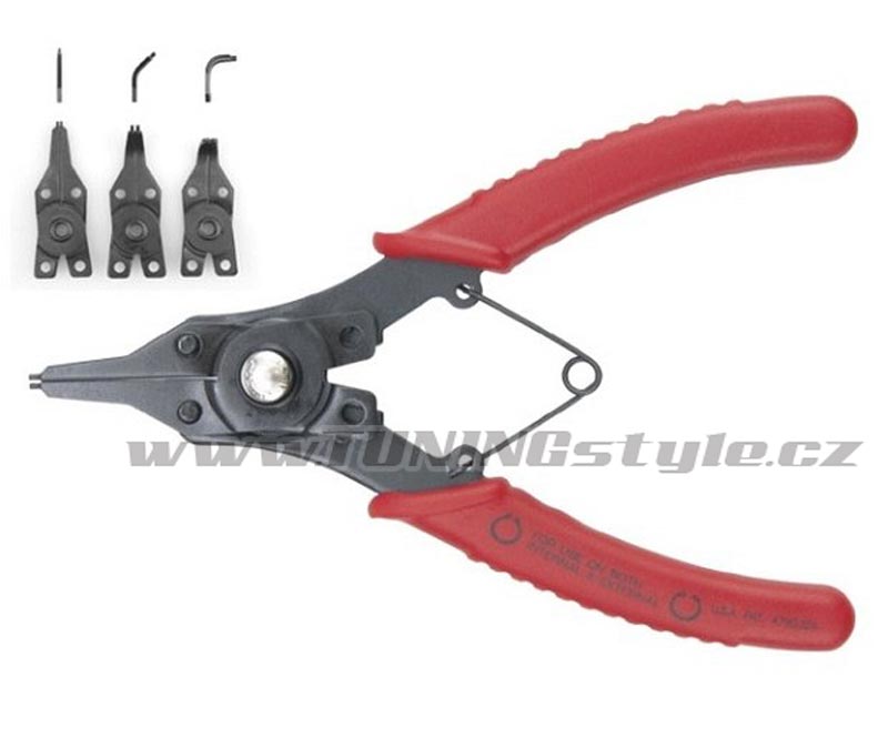 Kleště na segerovy pojistky, délka 160 mm se čtyřmi vyměnitelnými čelistmi.
