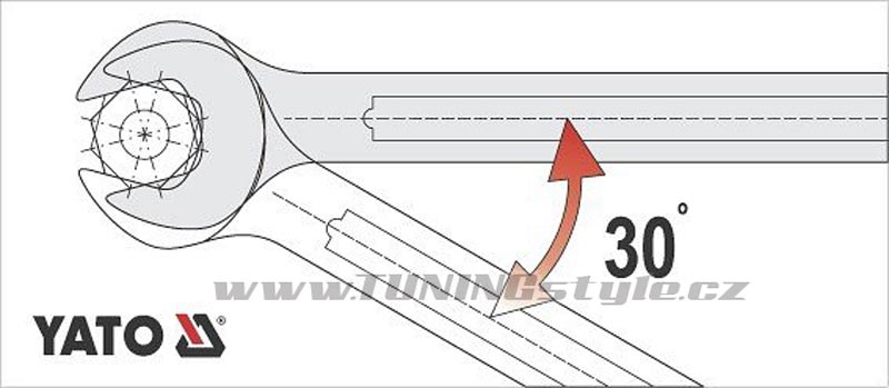 Očkoplochý klíč Yato vyrobený z chromvanadiové slitiny oceli, povrch je částečně satinovaný a leštěný do vysokého lesku. AS-Drive je vylepšený profil u nástrčných a očkových klíčů, v tomto případě očka.