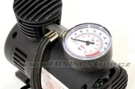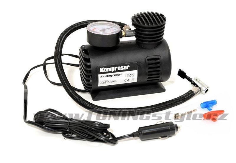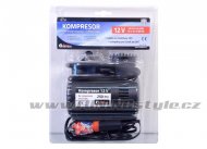 Vzduchový kompresor vybavený měřičem tlaku s celokovovým adaptérem pro klasický autoventilek. Napájení 12V, kabel se zástrčkou do zásuvky automobilového zapalovače. Součástí balení jsou přídavné adaptéry pro huštění gumových matrací, míčů apod.