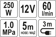 Výkonný kompresor s přesným manometrem a napájením na 12V - 13,8V. Určeno pro nafukování kol vybavených ventilem v automobilech, motocyklech a jízdních kolech a - s použitím výměnných špiček - matrace, pontony, míče. Technická data Výkon250W Max. tlak150 PSI (10 bar - 1 Mpa) Průtok vzduchu60 l/m Délka kabelu3m Napájení12V - 13,8V Výměnné trysky3 xSvítilnaLED Prodlužovací hadice5m Celý popis