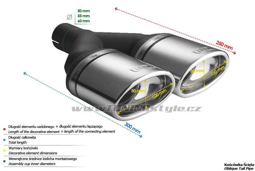 Sportovní nerezová koncovka ULTER SPORT Skvělý vzhled a špičková kvalita Rozměry: rozměr koncovky 120x80mm, délka: 250mm dostupné připojovací rozměry: 50/55/60mm (při objednávce uveďte požadovaný připojovací rozměr v poznámce) Koncovky z leštěné nerezové oceli. Snadná montáž pásovou svorkou (není součástí) Kvalita a dlouhá životnost – garantuje certifikát kvali... Celý popis