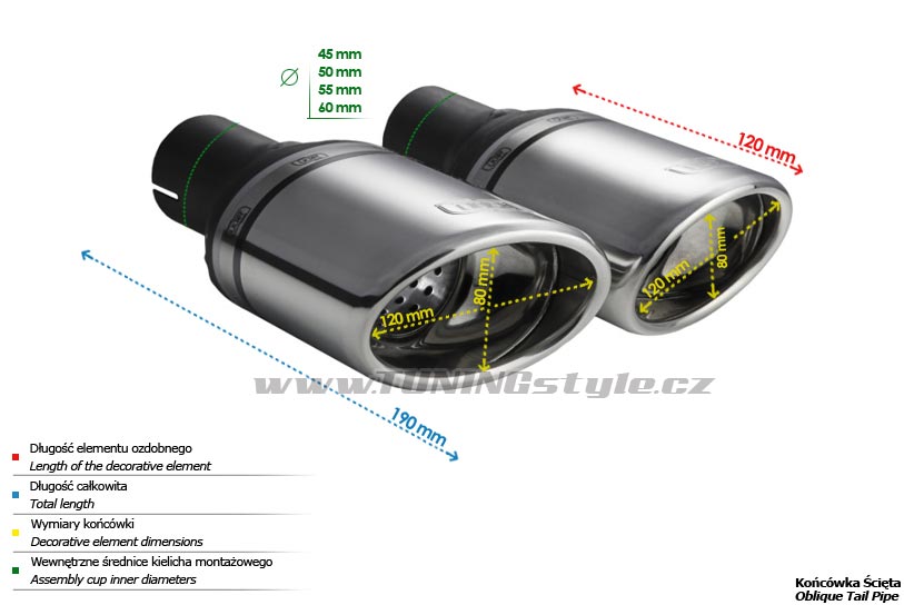 Sportovní nerezová koncovka ULTER SPORT Skvělý vzhled a špičková kvalita Rozměry: rozměr koncovky ovál 120x80mm, délka: 120mm dostupné připojovací rozměry 45/50/55/60mm (při objednávce uveďte požadovaný připojovací rozměr v poznámce) Koncovky z leštěné nerezové oceli. Snadná montáž pásovou svorkou (není součástí) Kvalita a dlouhá životnost – garantuje certifiká... Celý popis