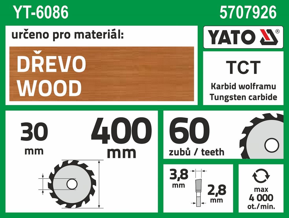 »  Nářadí  »  YATO  »  Vrtání, řezání a pilování  »  Kotouče ostatní  »  Kotouč na dřevo 400 x 30 mm 60z