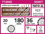 Pilový kotouč speciálně určený pro řezání stavebního dřeva (prken s hřebíky či s nečistotami jako zbytky cementu apod.).Jednotlivé zuby kotouče jsou vybaveny plátky ze slinutého karbidu (SK plátky), které nabízí vysokou kvalitu řezu a dlouhou životnost naostřeného břitu. Technická dataprůměr kotouče180 mmprůměr otvoru20 mmpočet zubů36šíře řezu2,4 mmšíře kotouče1,8 mmmax. povolené otáčky9 000 / ... Celý popis