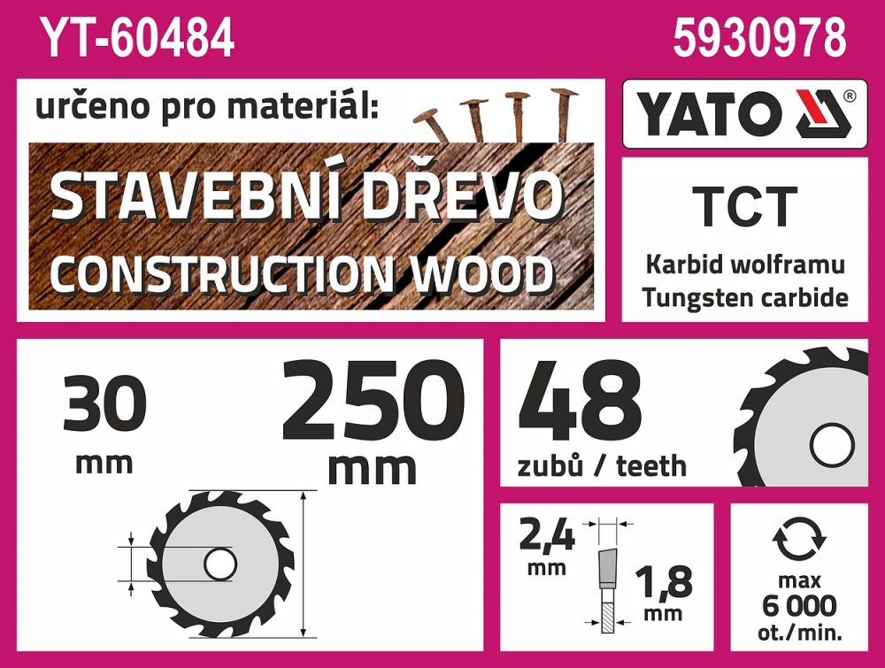 »  Nářadí  »  YATO  »  Vrtání, řezání a pilování  »  Kotouče ostatní  »  Kotouč na stavební dřevo 250 x 30 mm 48z
