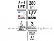 Univerzální montážní lampa vybavená 8 + 1 LED diodami. K napájení slouží 3x AA baterie, se kterými činí výdrž svícení až 4 hodiny, svícení lze podle zvoleného režimu nastavit na 3 polohy, a to plný, poloviční a přerušovaný svit. Světelný tok dosahuje hodnoty 280 lm. Lampa je vybavena silnými magnety ze zadní strany a výsuvným háčkem. Lampa tak může stát na rovné podložce, nebo ji lze díky uvede... Celý popis