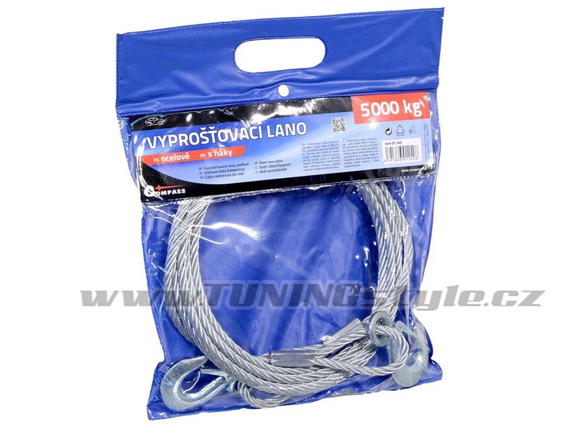 Ocelové lano s háky, určeno pro vyproštění vozidel. Délka 4 metry (+-5%), průměr 8mm, pevnost v tahu 5000 kg. Celý popis