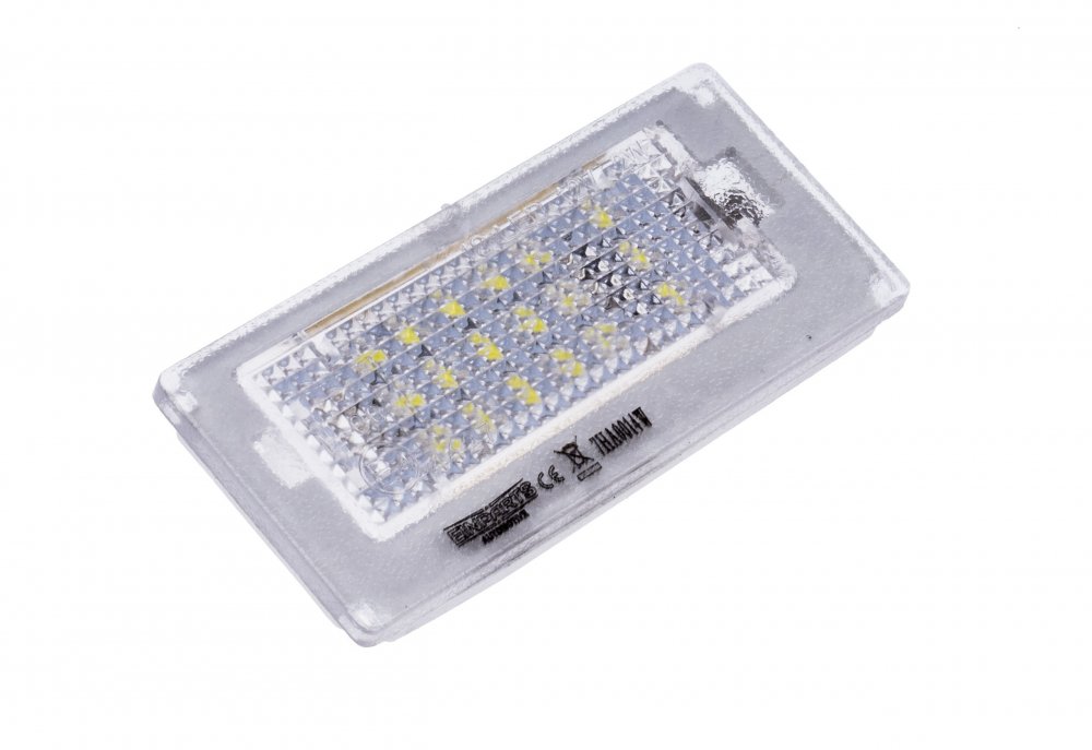2 x 1,8W (18 diod x 0,1W v každé lampičce) Druh LED diod: SMD Barva světla: 6000K (studená bílá) Rozměry: 73 mm x 34 mm x 12 mm (délka x šířka x hloubka) Homologace: E4 (vyražena na každé lampičce) Kompatibilita CAN-BUS: