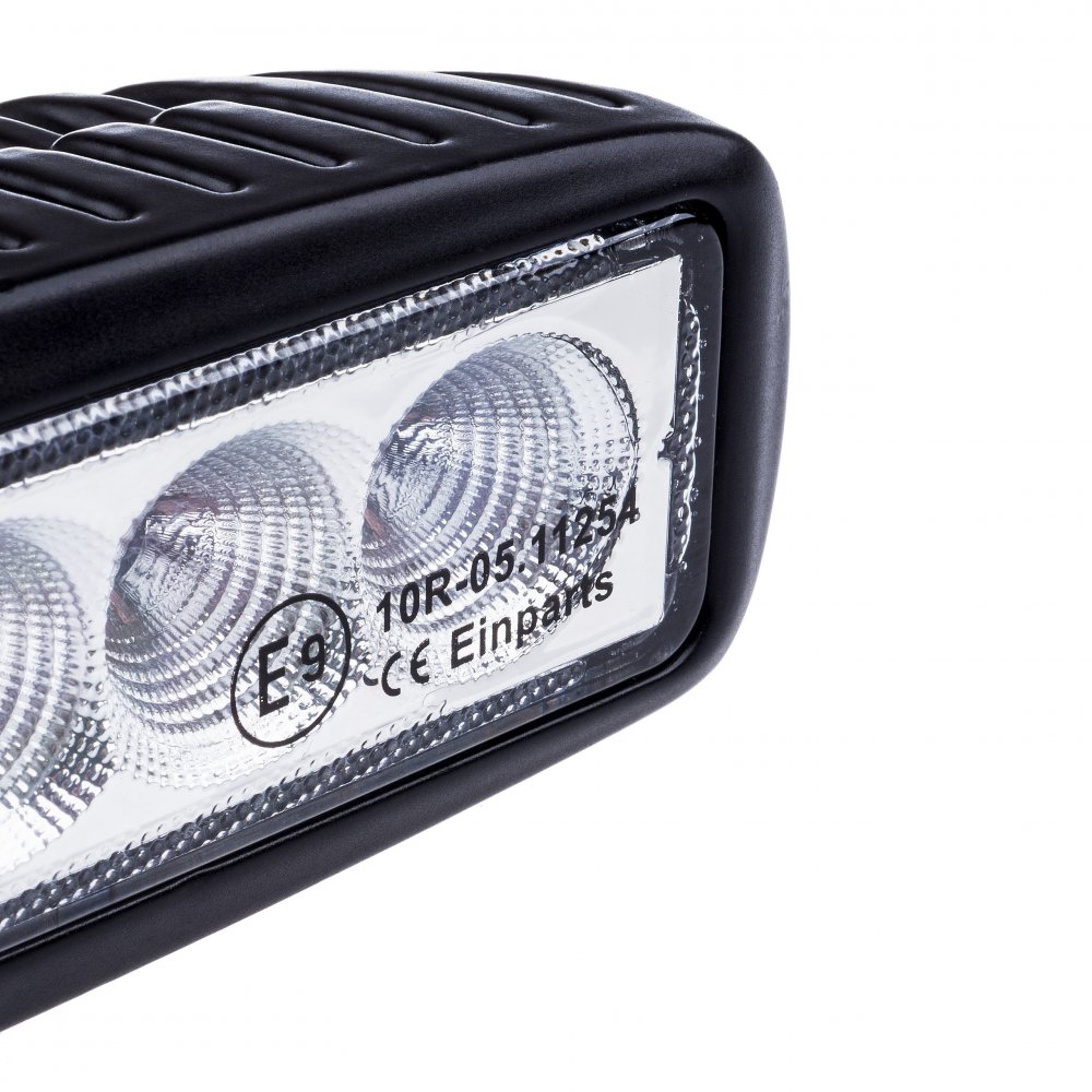 LED Pracovní světlo 18W (6 x 3W) CREE 60° Specifikace: Maximální výkon: 18W Druh LED diod: CREE Svítivost: 2430 lm Počet diod: 6 x 3W Vyzařovací úhel: 60° (rozptylové) Barva světla: 6000K (studená bílá) Rozměry: 160 mm x 46 mm x 56 mm (délka x šířka x hloubka) Homologace: Ne, E9, 10R-05.11254* Pracovní teploty: -40 °C až +50 °C Napájecí napětí: 9 - 32 V Doplňkové informace: - světlo odolné prot... Celý popis
