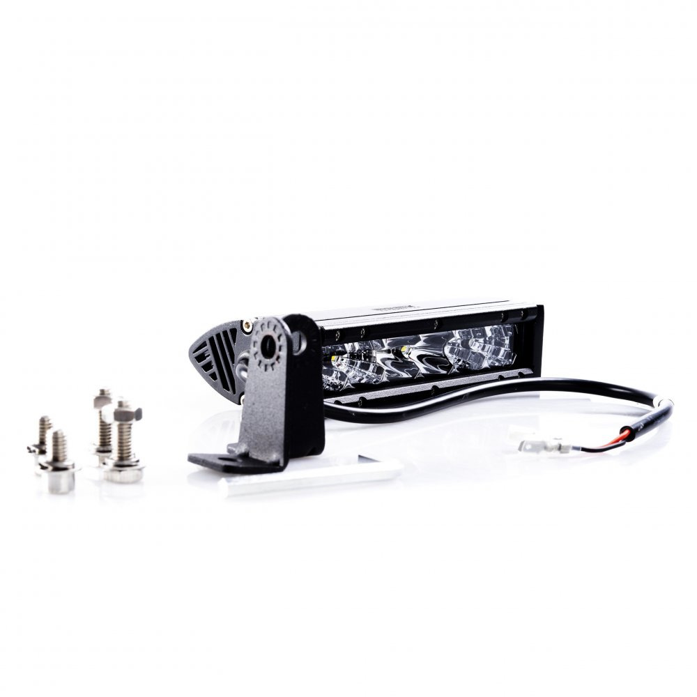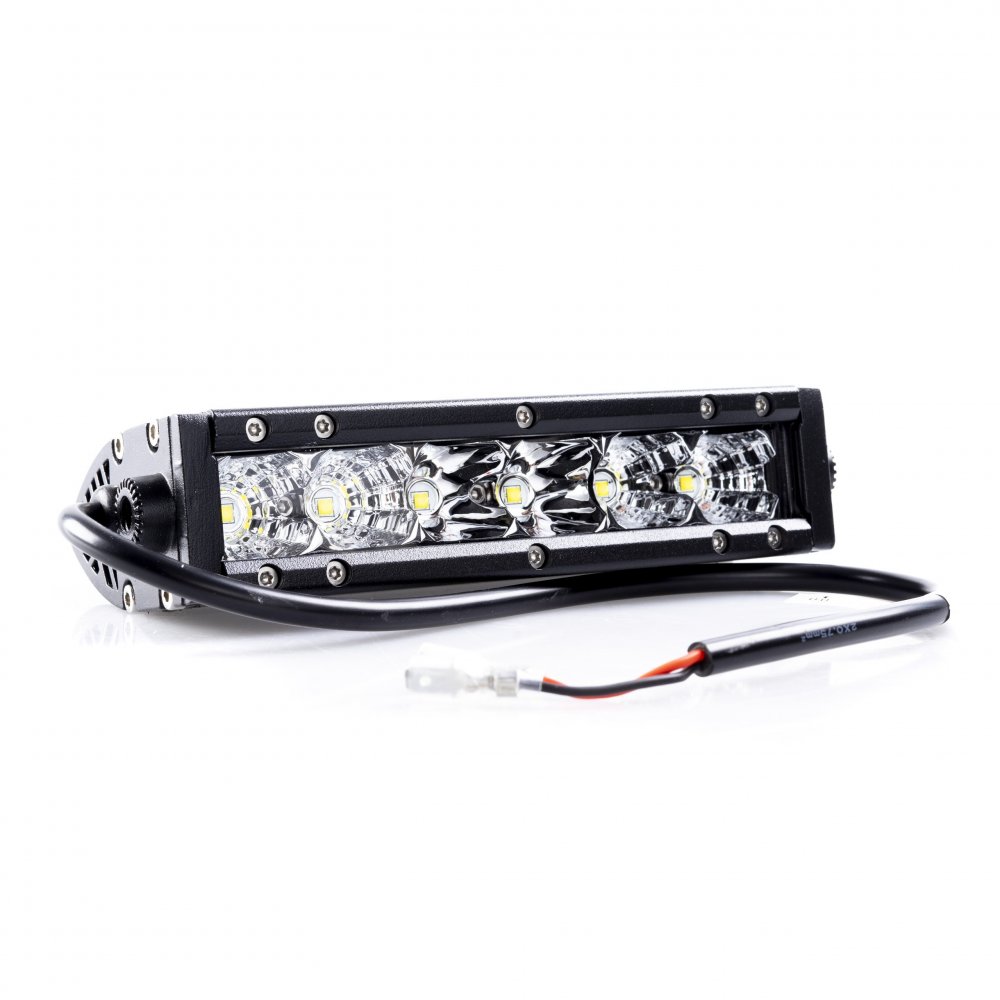 Maximální výkon: 30W Druh LED diod: CREE Svítivost: - lm Počet diod: 6 x 5W Vyzařovací úhel: 30/60° (hybridní světlo - krajní LEDky s tvarově odlišným odrážecím pro rozptyl světla 60°) Barva světla: 6000K (studená bílá) Rozměry: 180 mm x 41,6 mm x 82 mm (délka x šířka x hloubka) Homologace: Ne* Pracovní teploty: -40 °C až +50 °C Napájecí napětí: 9 - 32 V Doplňkové informace: - světlo odolné proti dešti (typ ochrany IP67) - hliníkový kryt (unikátní struktura žebrování výborně odvádí teplo) - doba životnosti přes 30.000 hodin Obsah sady: LED pracovní světlo Montážní sada (závěsník, šrouby, matice)