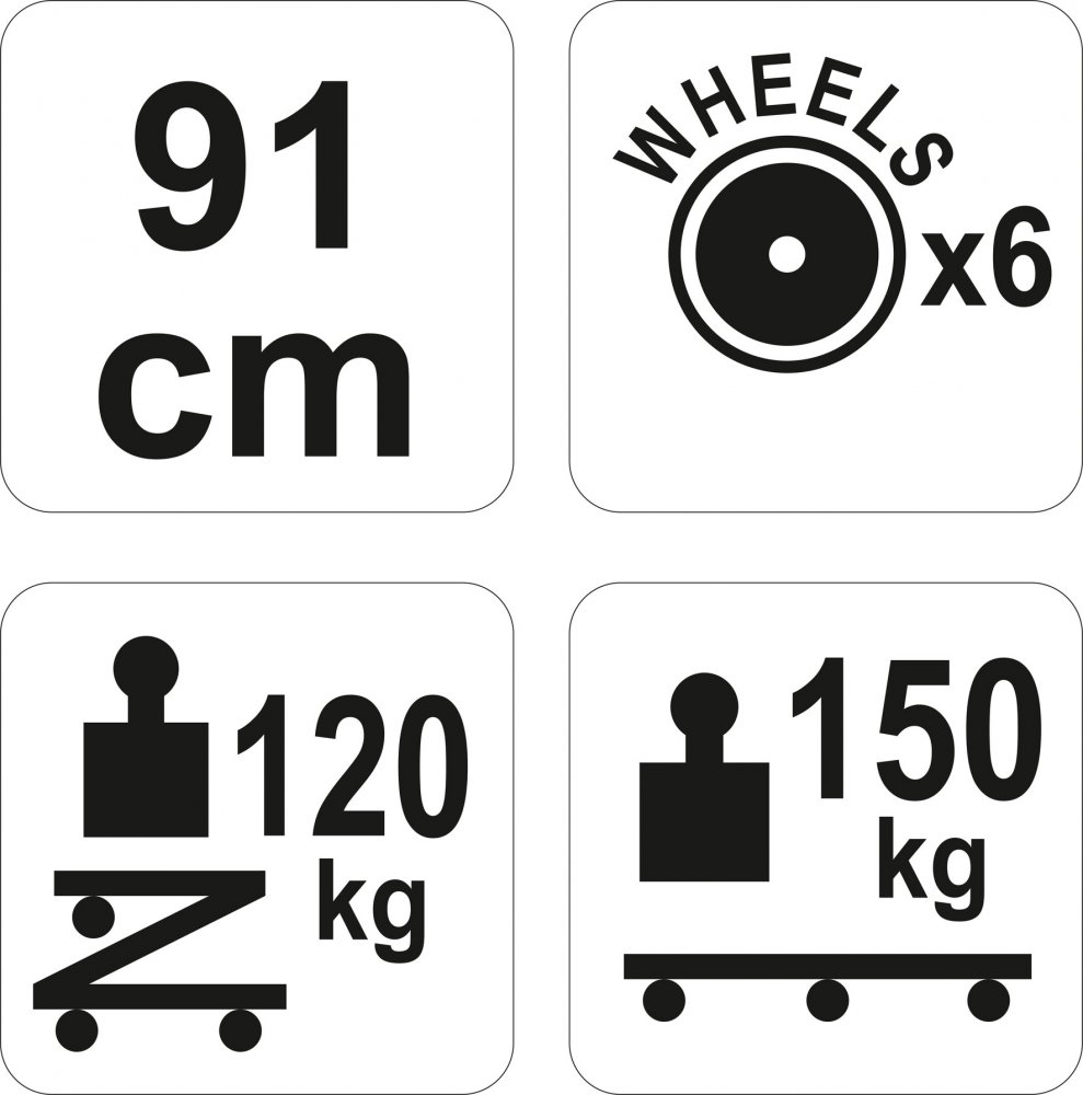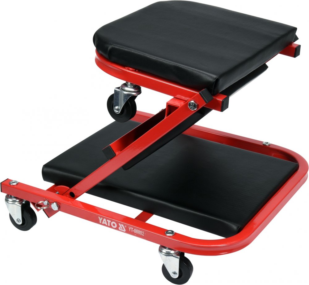 Dílenské lehátko s možností složení do podoby křesílka. Rám je vyroben z bytelného kovu a sedák je vyrobeno z pohodlného materiálu. Lehátko je vybaveno 6 otočnými kolečky na ložisckách, pro usnadněnou manipulaci. Lehátko má nosnost 150 kg a délku 91 cm. Tahem lze lehátko přeměnit na praktickou a pohodlnou dílenskou stoličku s nosností 120 kg. Celý popis