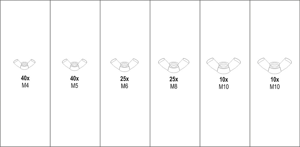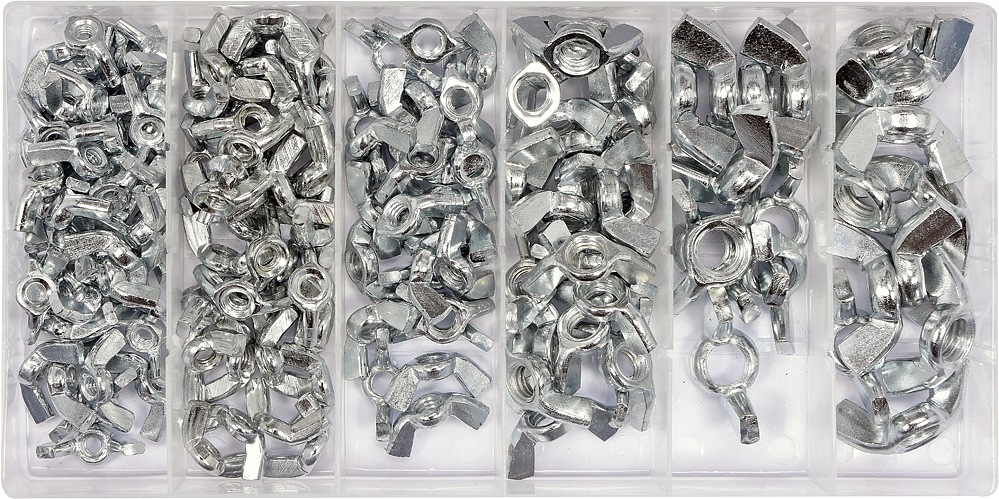 Sada 150 ks metrických křídlových matic. Vše je přehledně uspořádáno v kompaktním plastovém kufříku. Obsah balení 40x M4 40x M5 25x M6 25x M8 10x M10 10x M10 Celý popis