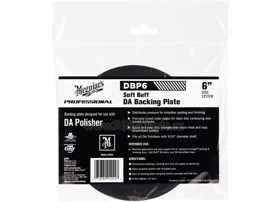 Unašeč DBP6 je určen pro použití s MT310 Meguiar's DA leštičkoua dalšími orbitálními leštičkami s průměrem závitu 5/16". Slouží pro uchycení pěnových kotoučů Meguiar's Soft Buff 2.0 o průměru 7" (W7207, W8207 a W9207) a mikrovláknových kotoučů DA Microfiber o průměru 6" (DMC6 a DMF6).