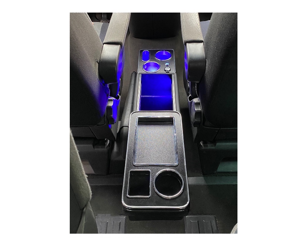 • Multifunkční středová konzole pro VW T5 a T6 s úložným prostorem, USB, 12V podsvícená, černý lesk