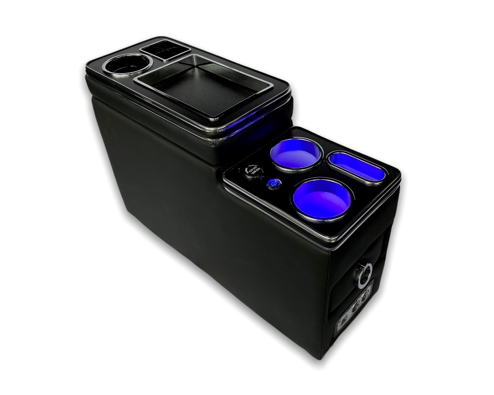 Podsvícená středová konzole s úložným prostorem, USB 12V v černém lesku Celý popis