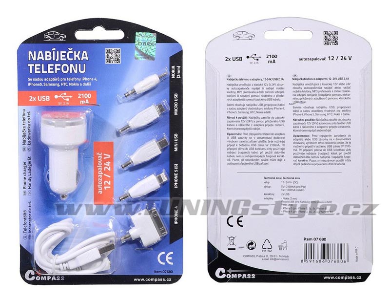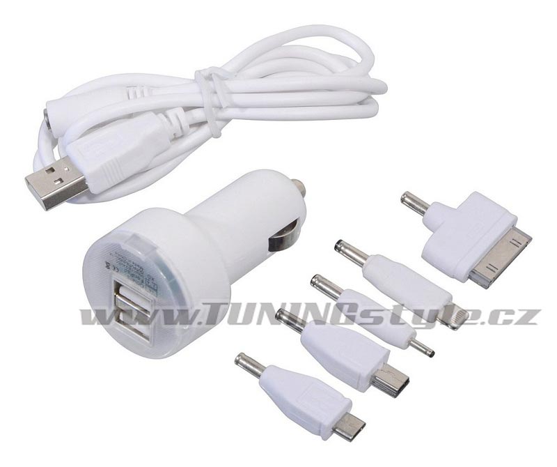 Nabíječka umožňující nabíjení z klasické 12V či 24V zásuvky autozapalovače. Zařízení je schopné napájet či nabíjet mobilní telefony, MP3 přehrávače a další zařízení schopné dobíjení či napájení pomocí některého z přiložených adaptérů či pomocí klasického USB kabelu. Balení obsahuje USB nabíječku s 12-24V napájením a propojovací kabel s integrovanými konektory (USB-C / Mini USB / Micro USB / iP... Celý popis