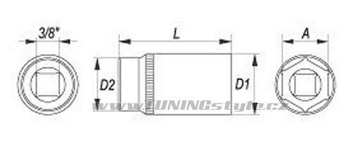 Nástavec hluboký šestihranný 3/8"(10mm) vyroben z kvalitní chromvanadiové slitiny oceli CrV 50BV30 a splňující normu DIN 3121 s celkovou délkou 63mm. Funkce AS-DRIVE umožňuje vyvinout větší kontaktní sílu, neboť ke kontaktu se šroubem nedochází na hranách šestihranu, nýbrž v první třetině styčných ploch. Tím nedochází k poničení hlavice šroubu a ořech mnohdy povolí i matice a šrouby již poničené.