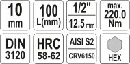 Profesionální šestihranný bit Imbus (HEX) pro 1/2" ráčnu.Nástavec je precizně a přesně zhotoven z pochromované oceli CrV6150 a samotný bit z nerezové oceli AISI S2 vrstvené niklem pro vysokou odolnost.Materiál byl podroben zkoušce tvrdosti pro tvrdé materiály podle Rockwella, s výslednou tvrdostí HRC58-62.Nepostradatelným nástrojem pro profesionály a výbavu každé garáže.Technická datavelik... Celý popis