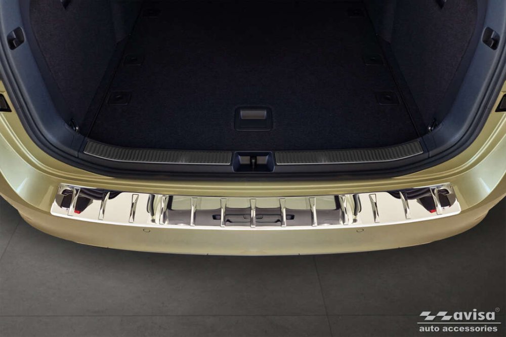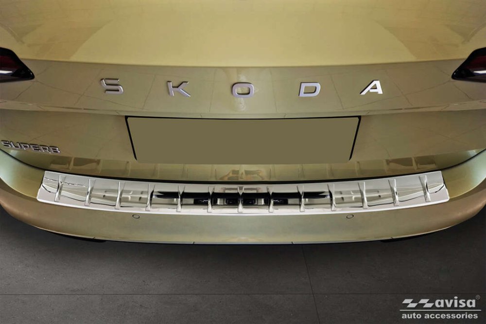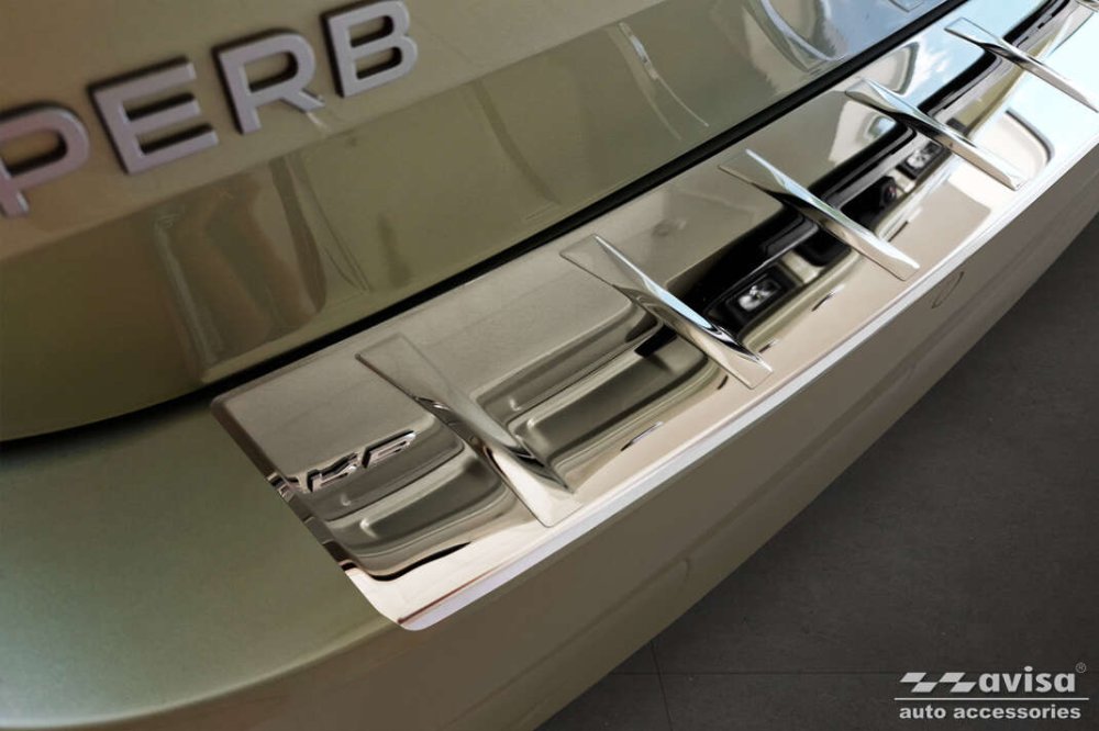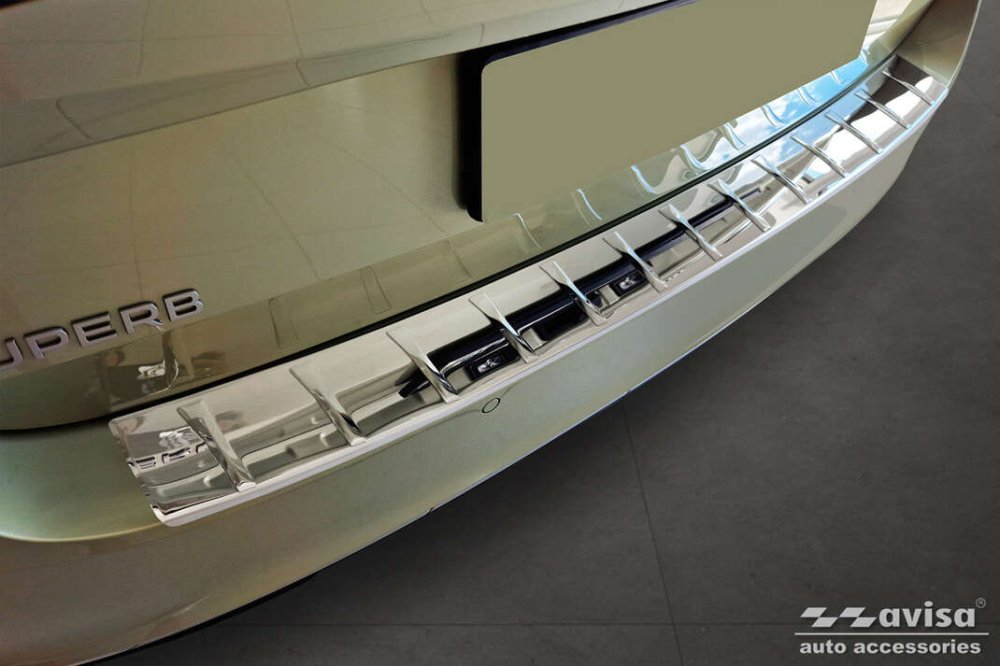» Exteriér » Nášlapy kufru » Nerezová ochranná lišta zadního nárazníku Avisa pro Škoda Superb IV Kombi - stříbrný lesklý