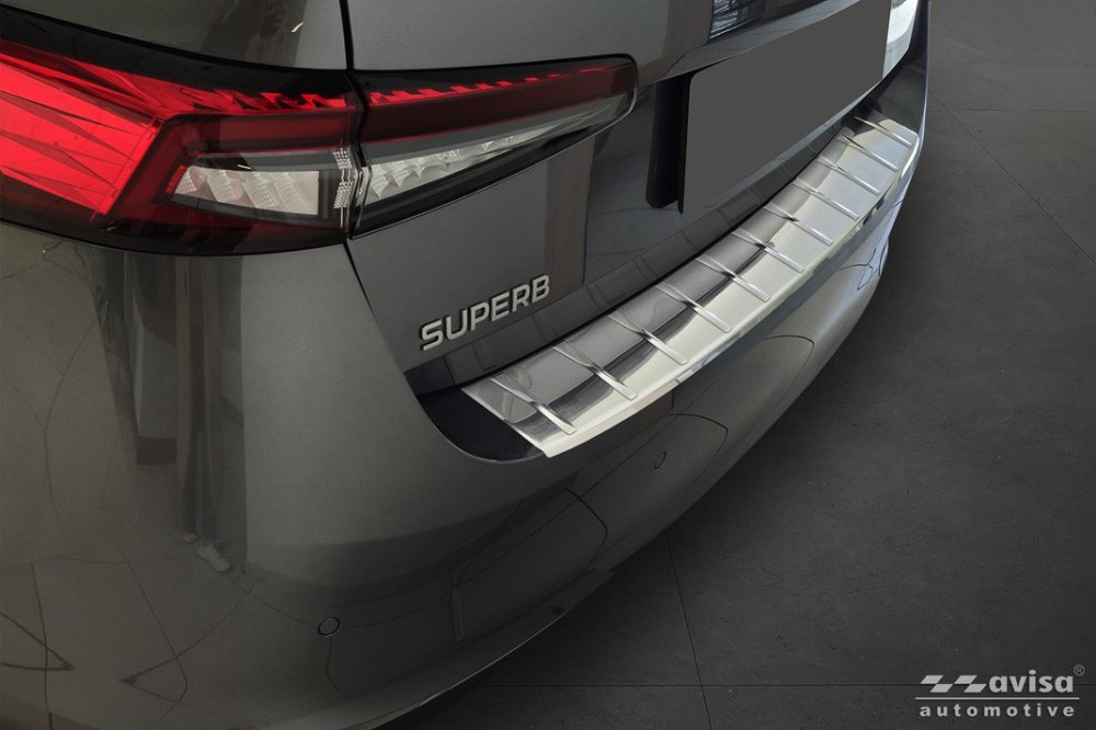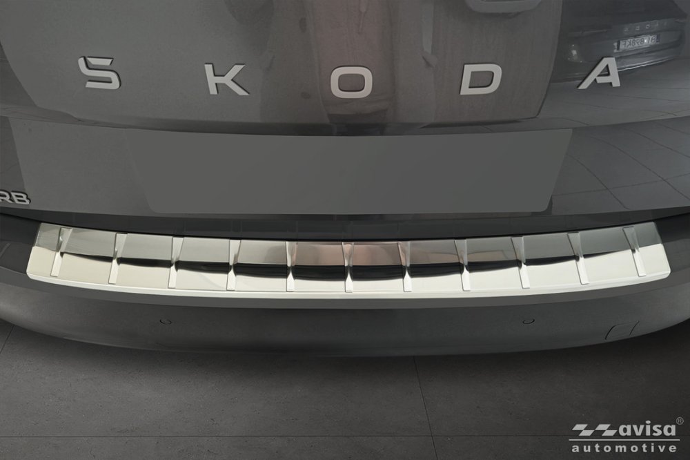 » Exteriér » Nášlapy kufru » Nerezová ochranná lišta zadního nárazníku Avisa pro Škoda Superb IV Liftback - stříbrná broušená